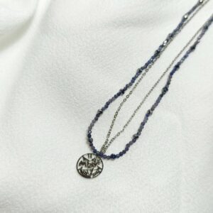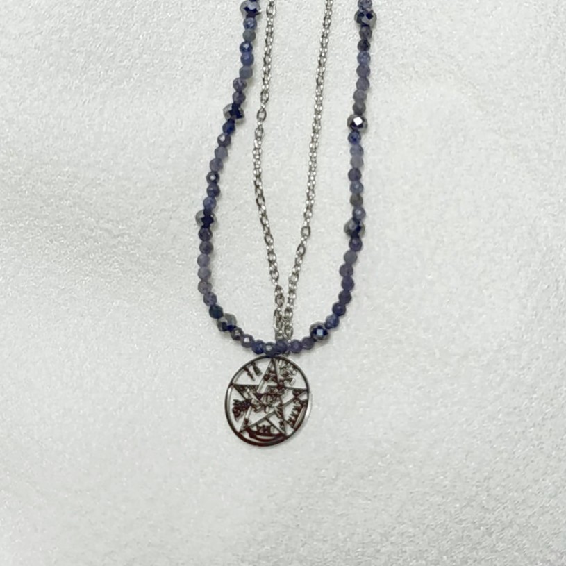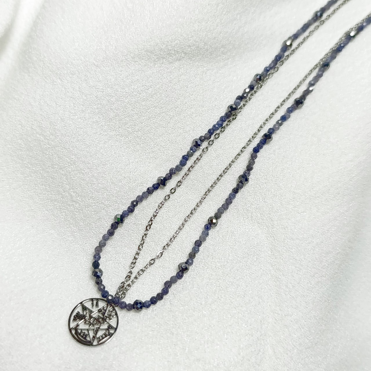 Este collar combina cristaloterapia y simbolismo energético, convirtiéndose en un accesorio lleno de intención y elegancia. Su pieza central presenta el símbolo del Tetragramaton en color plateado.