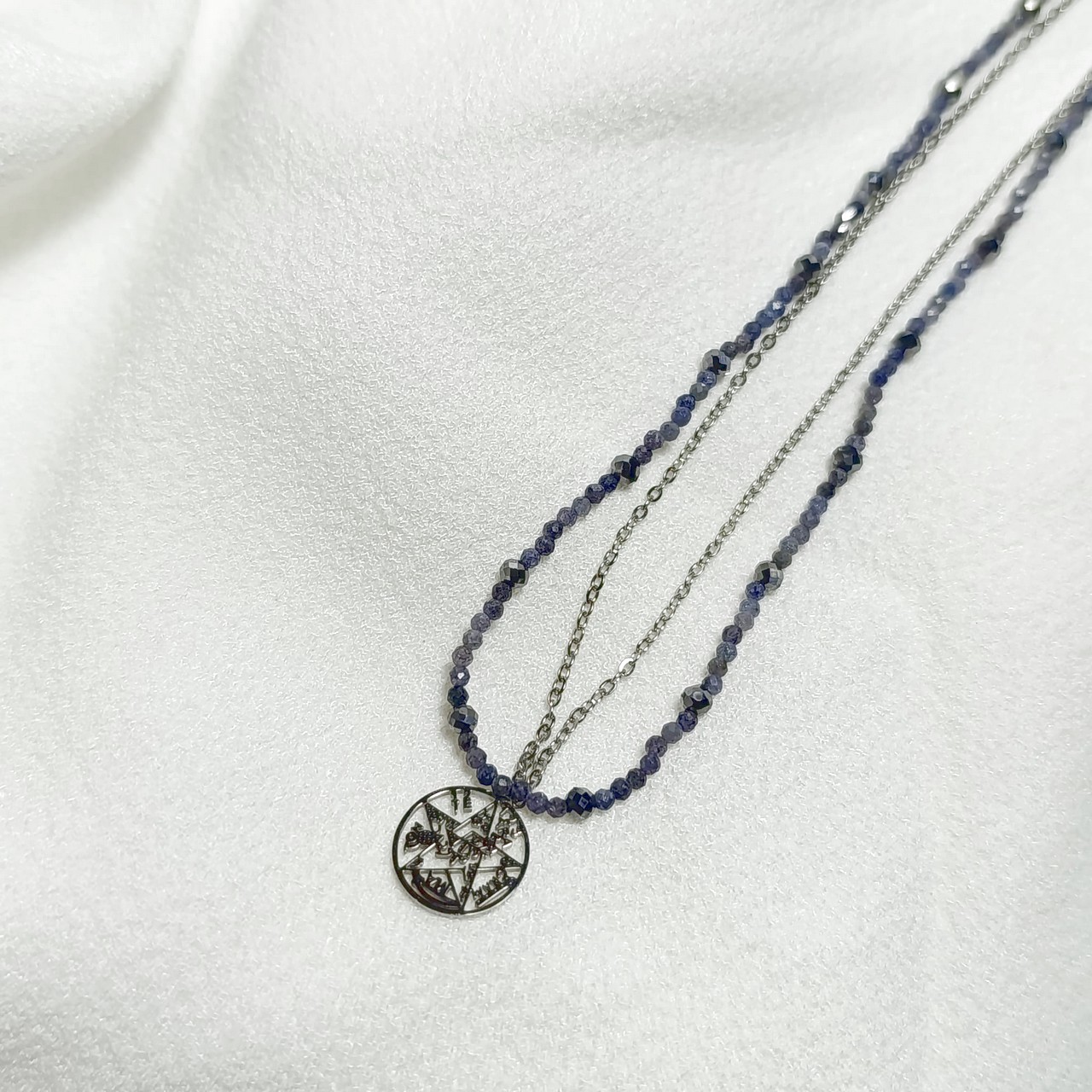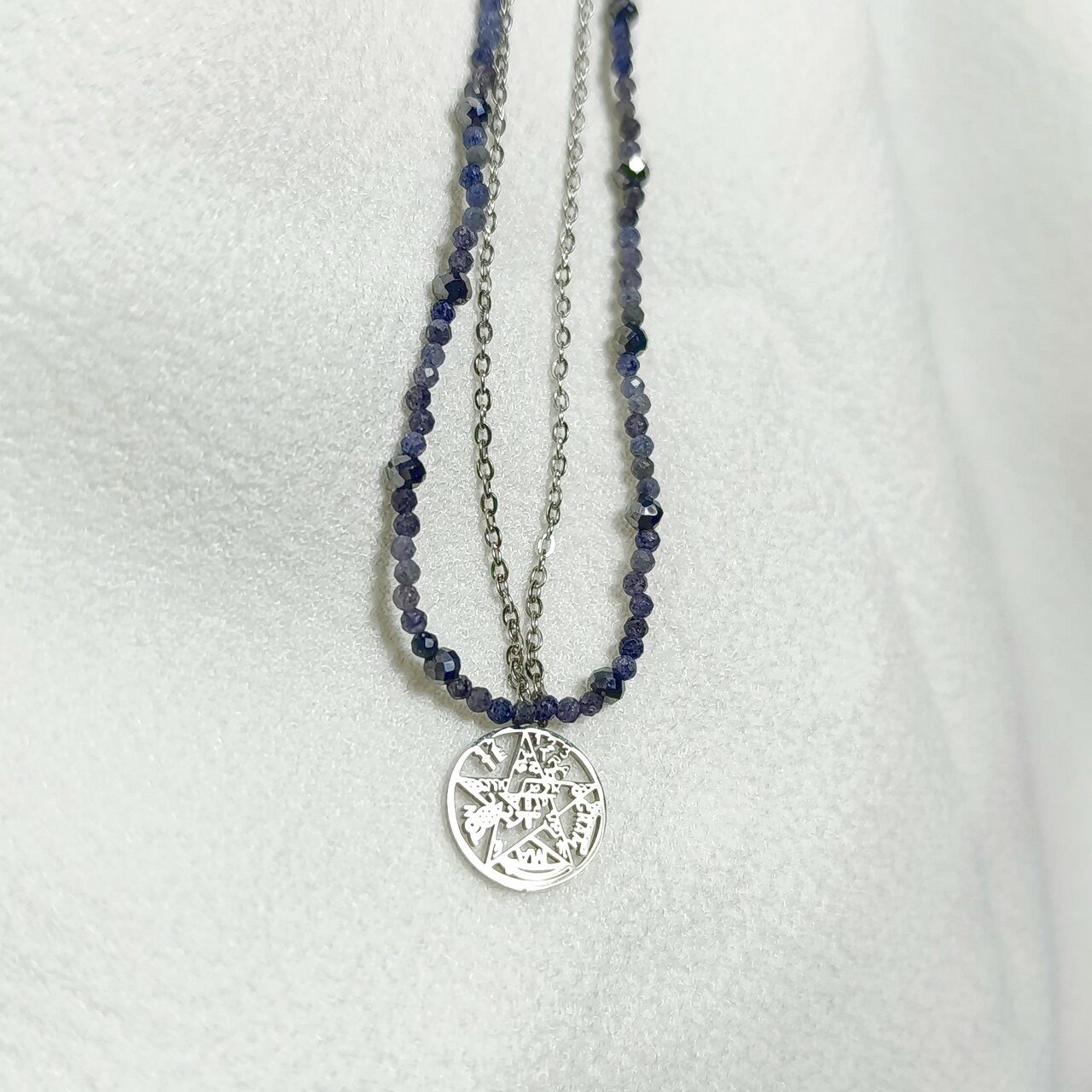 La cadena fina en acero color plateado porta el símbolo del tetragramaton, añadido lleva un collar de zafiro azul de 2,5mm, con piezas intercaladas de terahertz