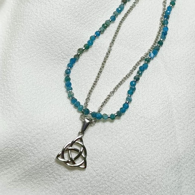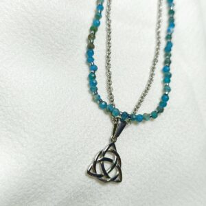 La cadena fina en acero color plateado porta el símbolo del trisquel, añadido lleva un collar de apatita azul y hematite como fundamentadora.