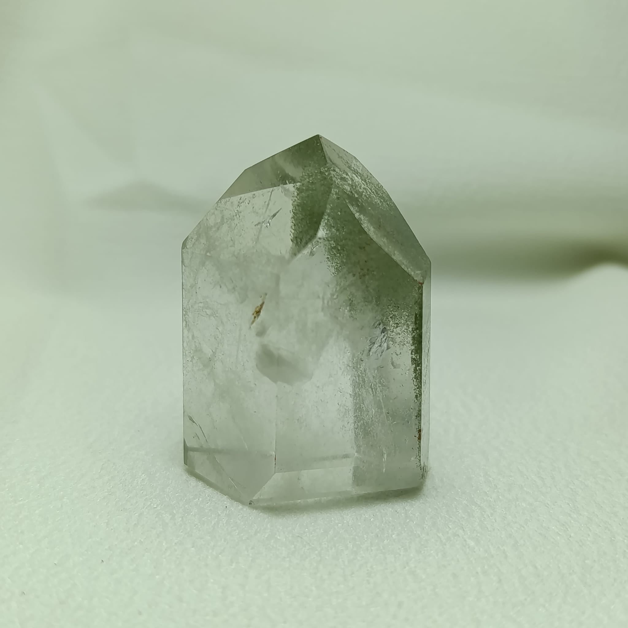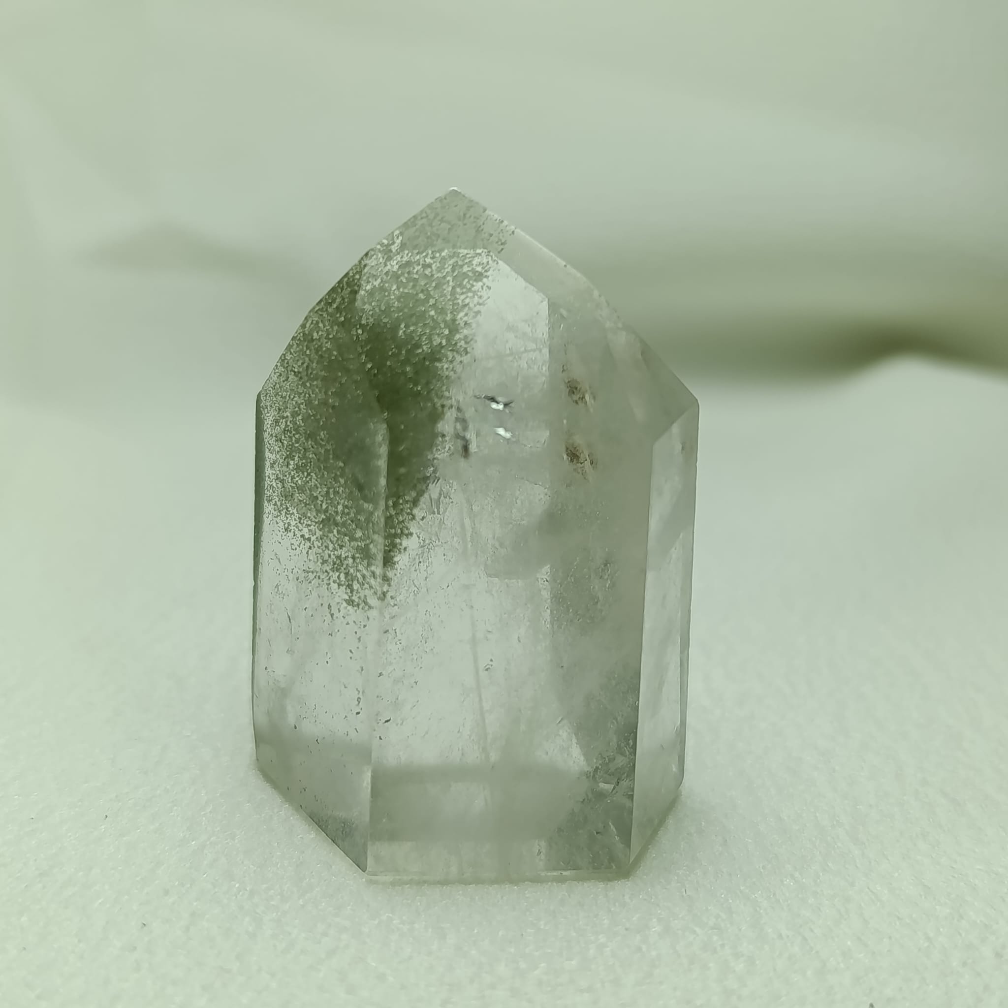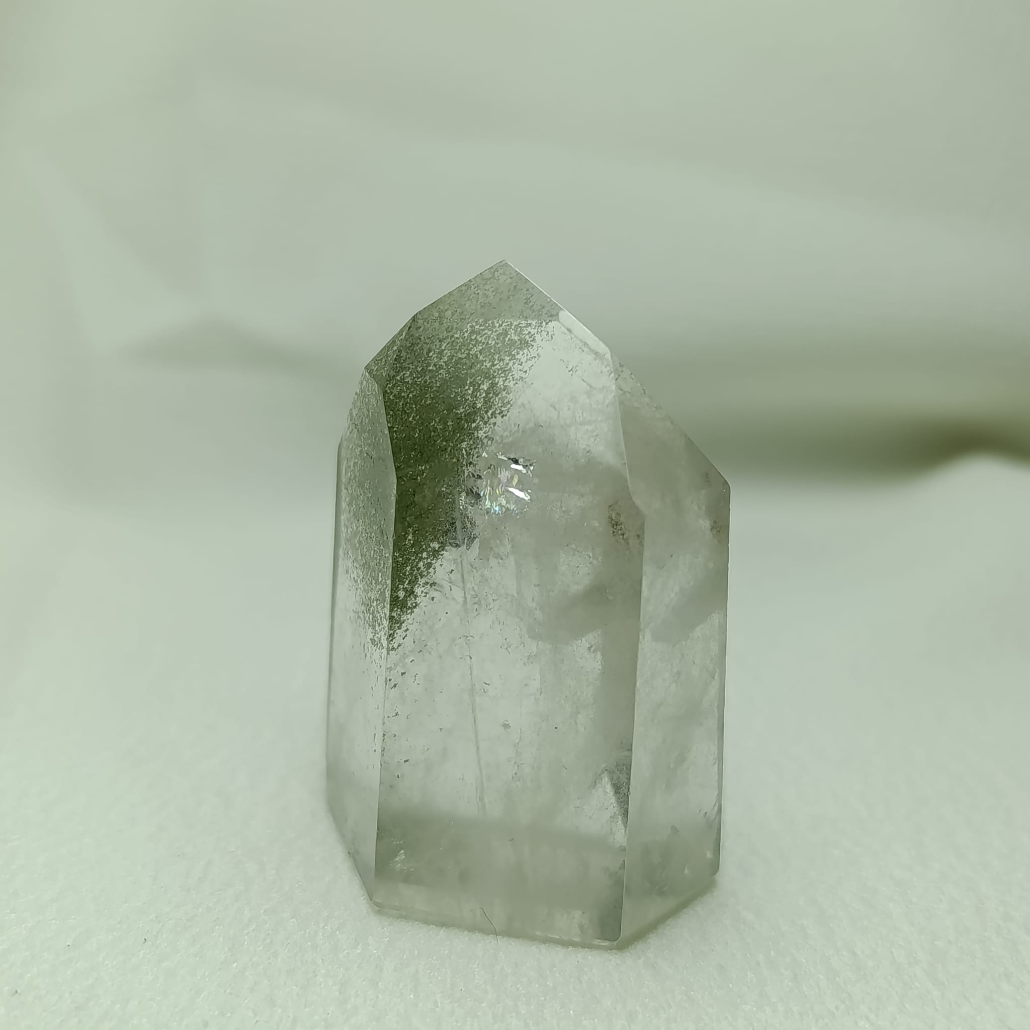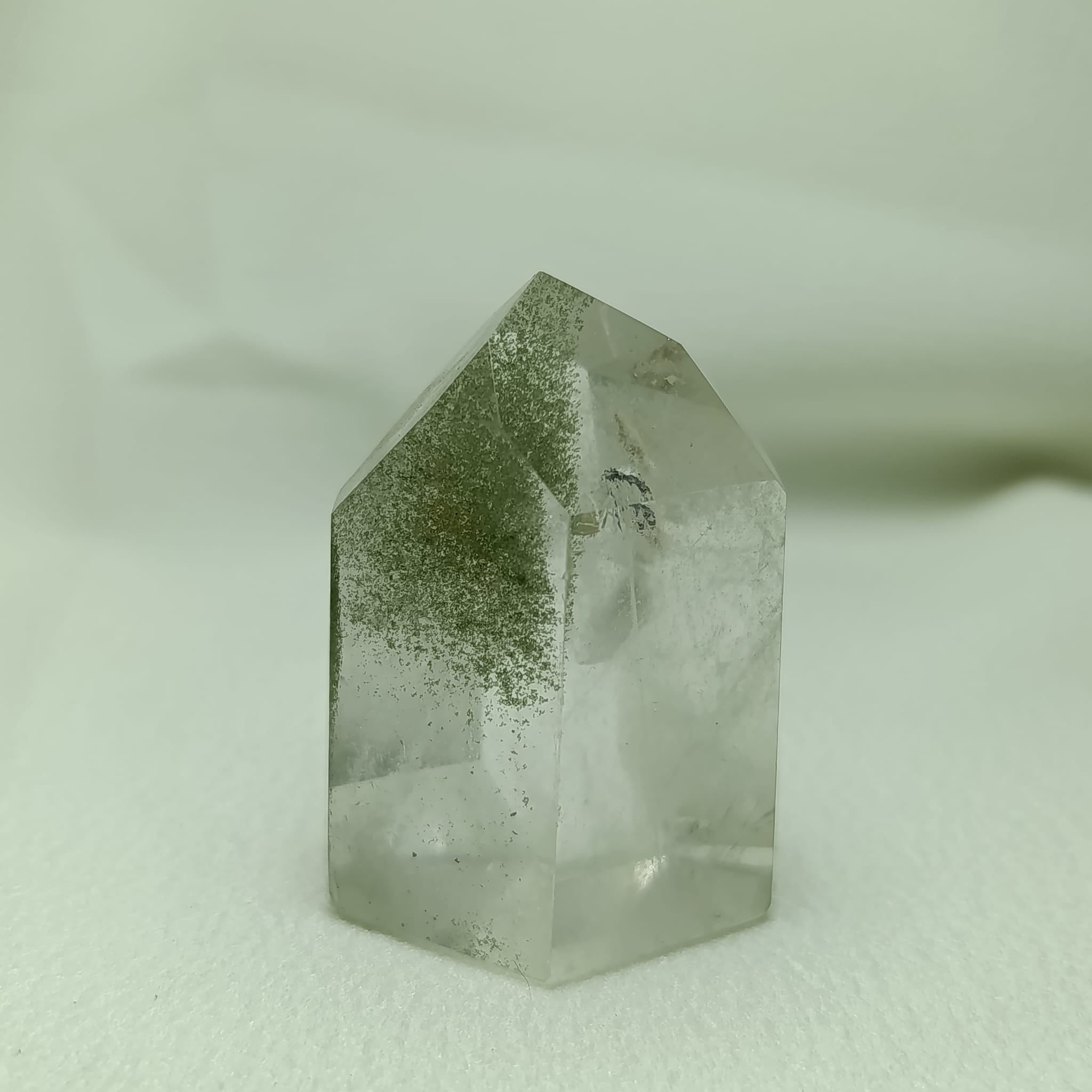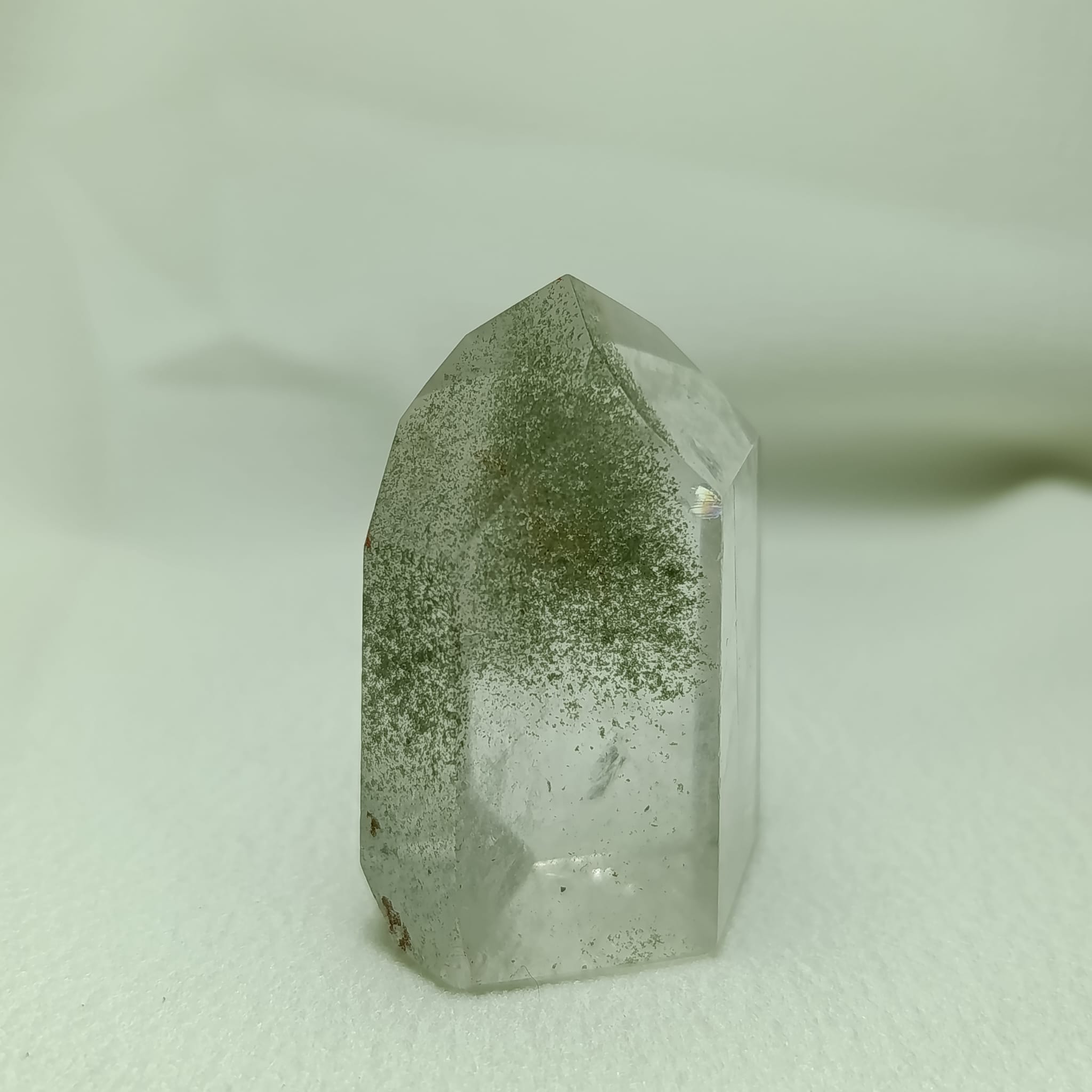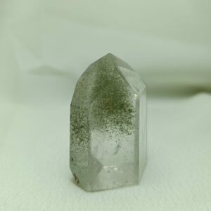 El cuarzo cristal de roca con inclusiones de clorita (Magnesio, hierro, aluminio y agua estructural). Sistema trigonal. Dureza 7 (Mohs).