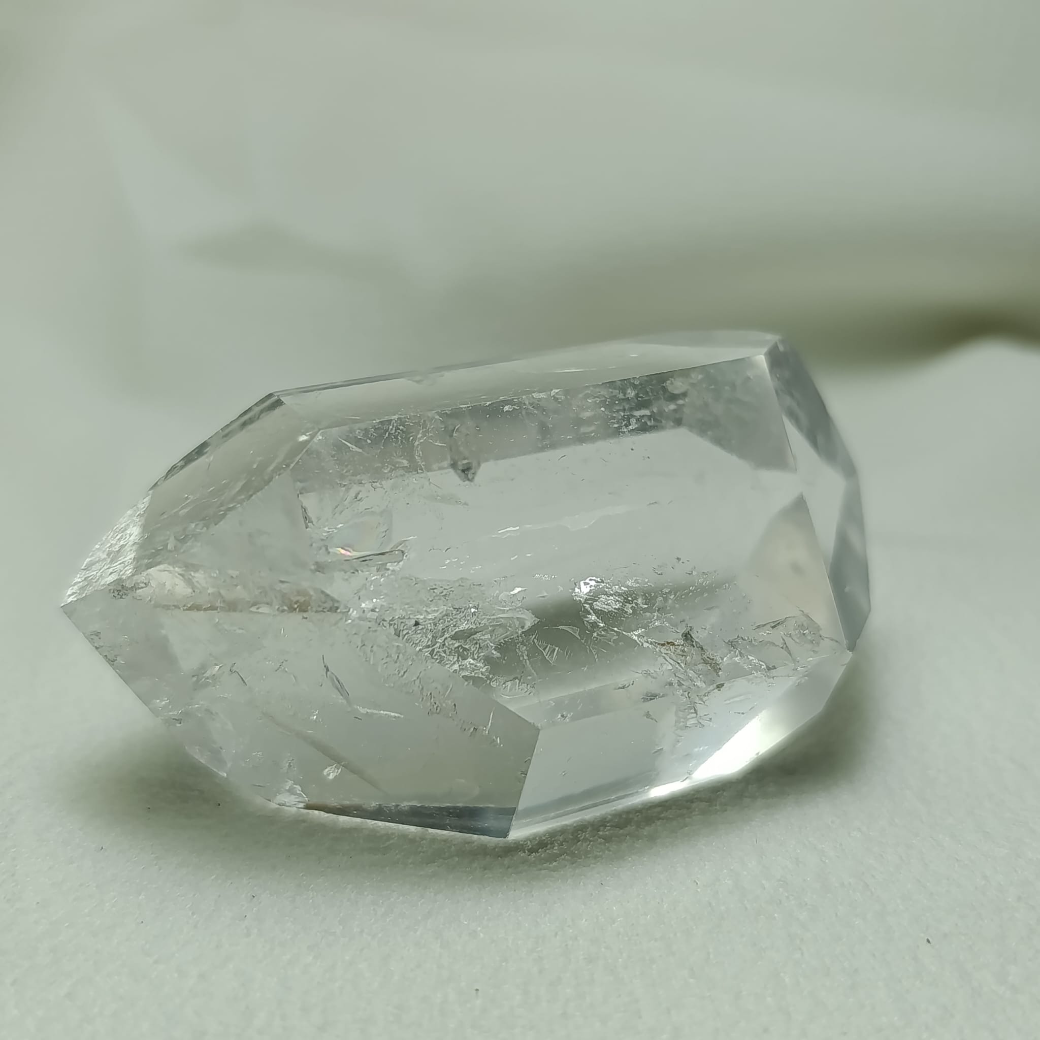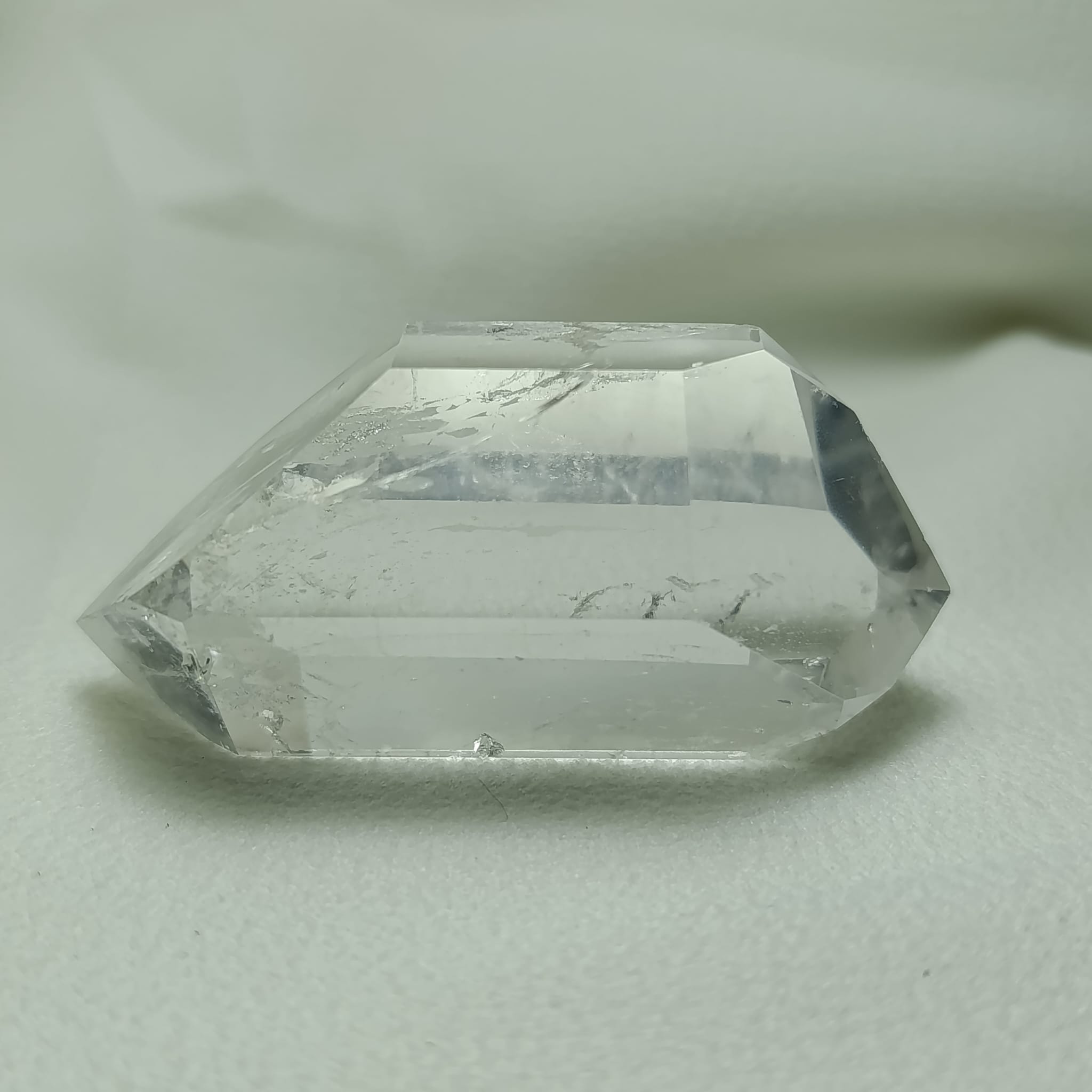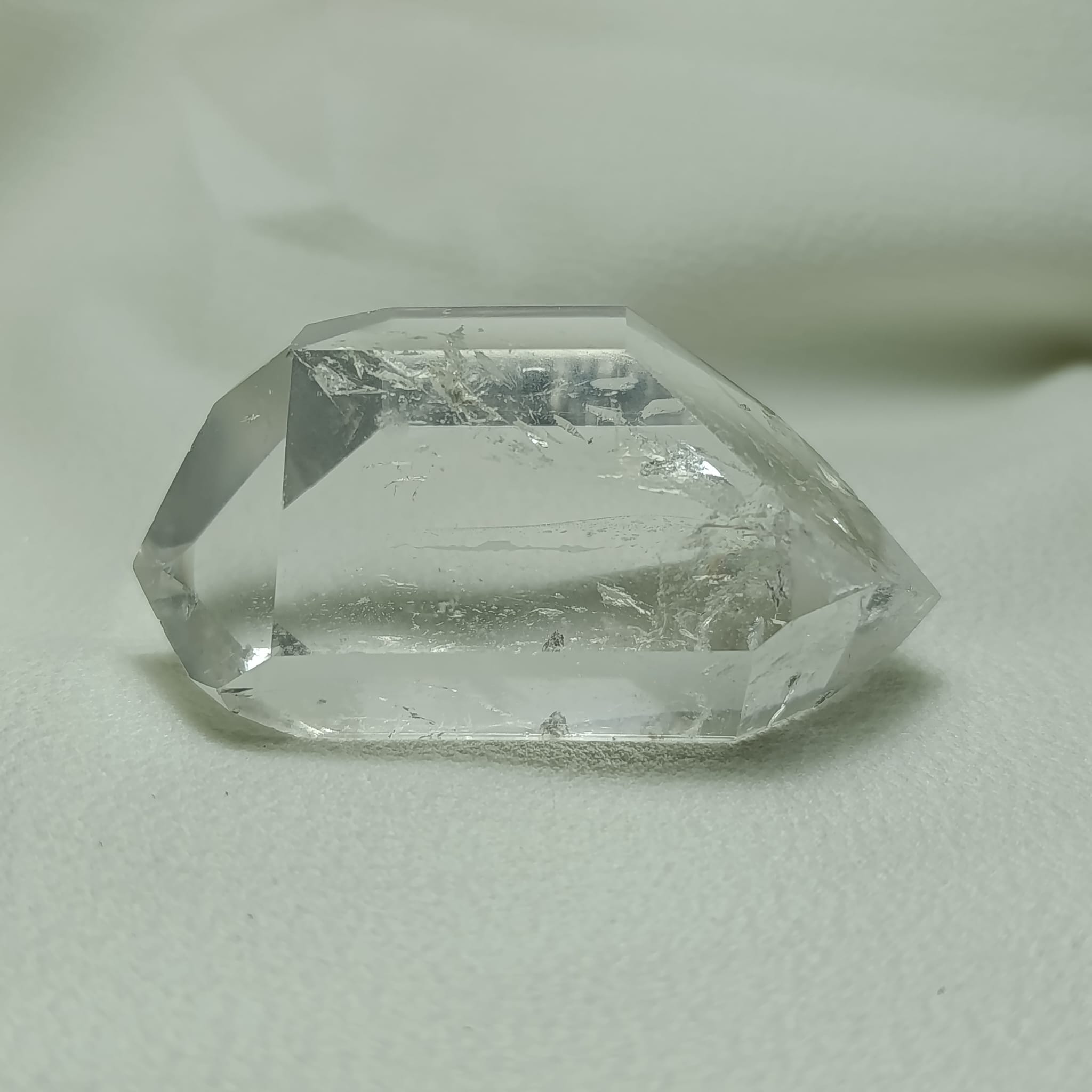 Cuarzo biterminado de cuarzo hialino (cuarzo cristal de roca). Biterminado natural. Transparencia media-alta, con zonas internas dispersas. Sistema trigonal. Dureza 7 (Mohs).