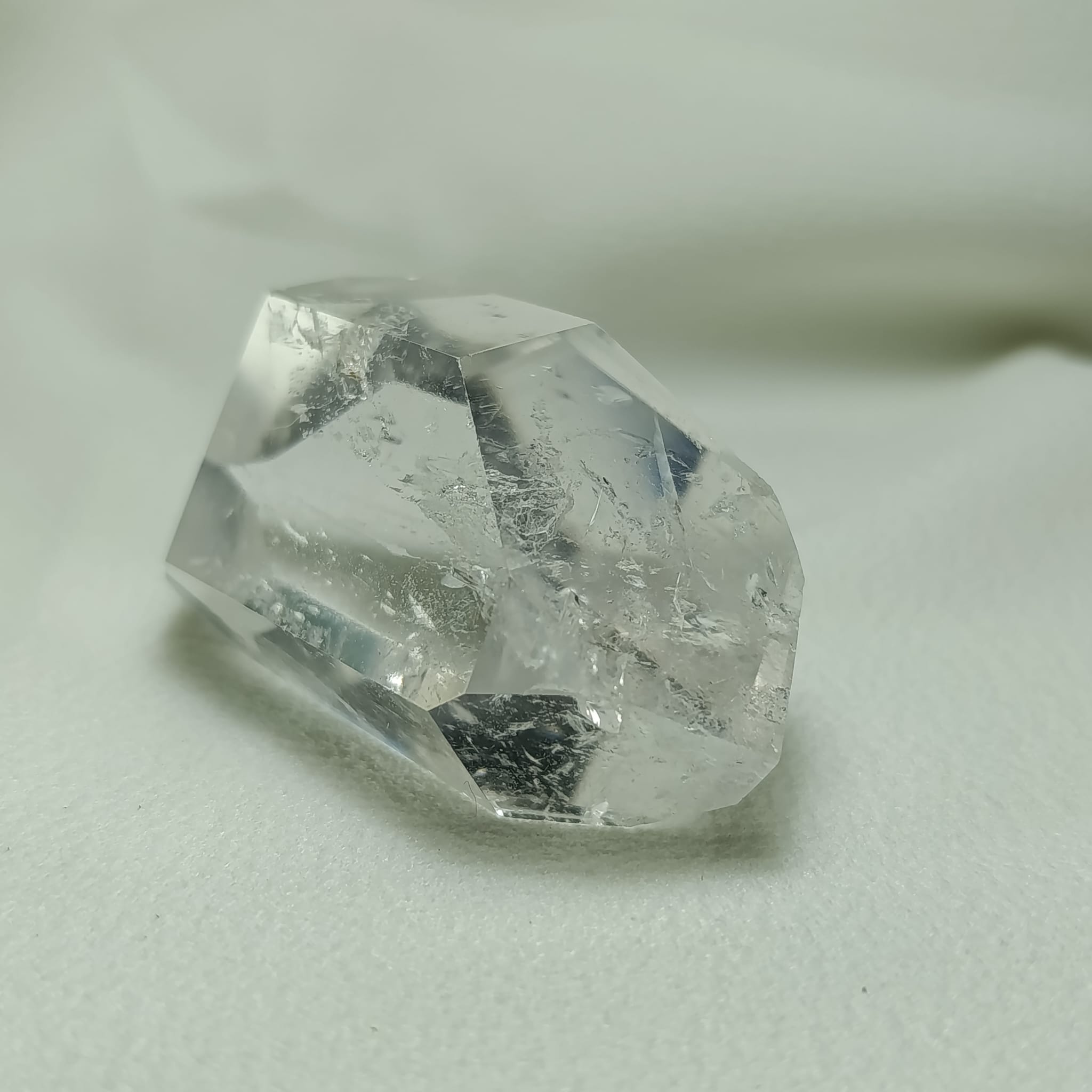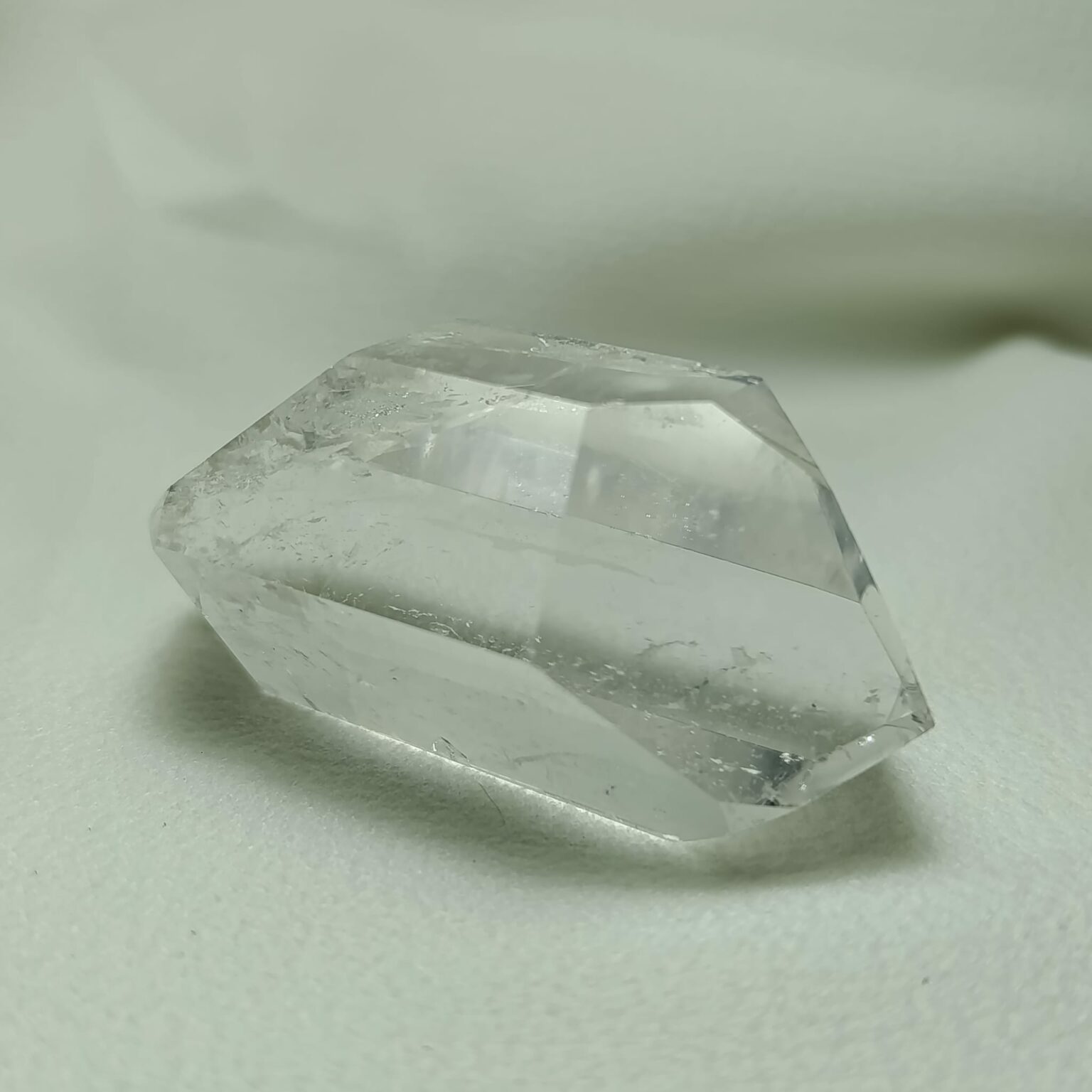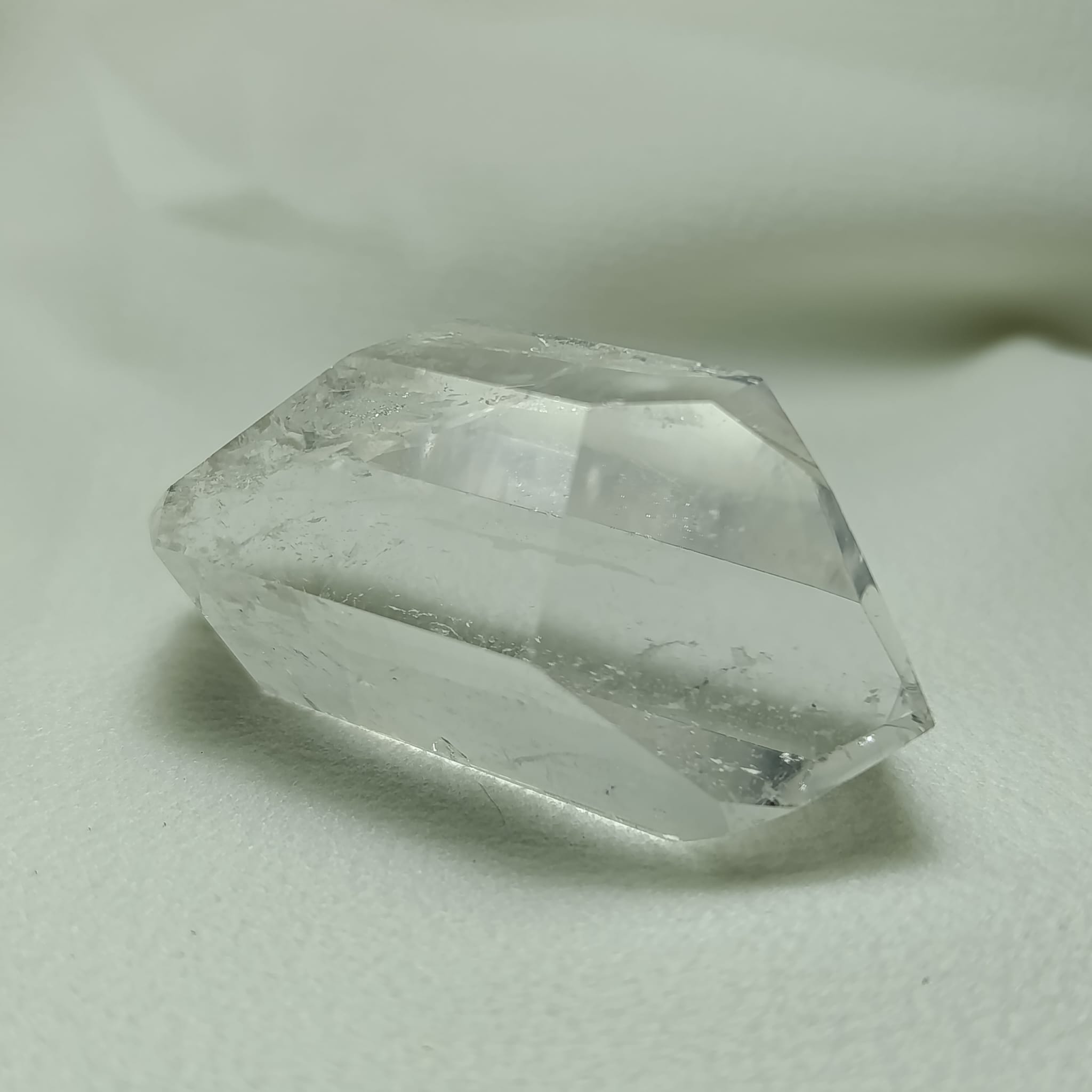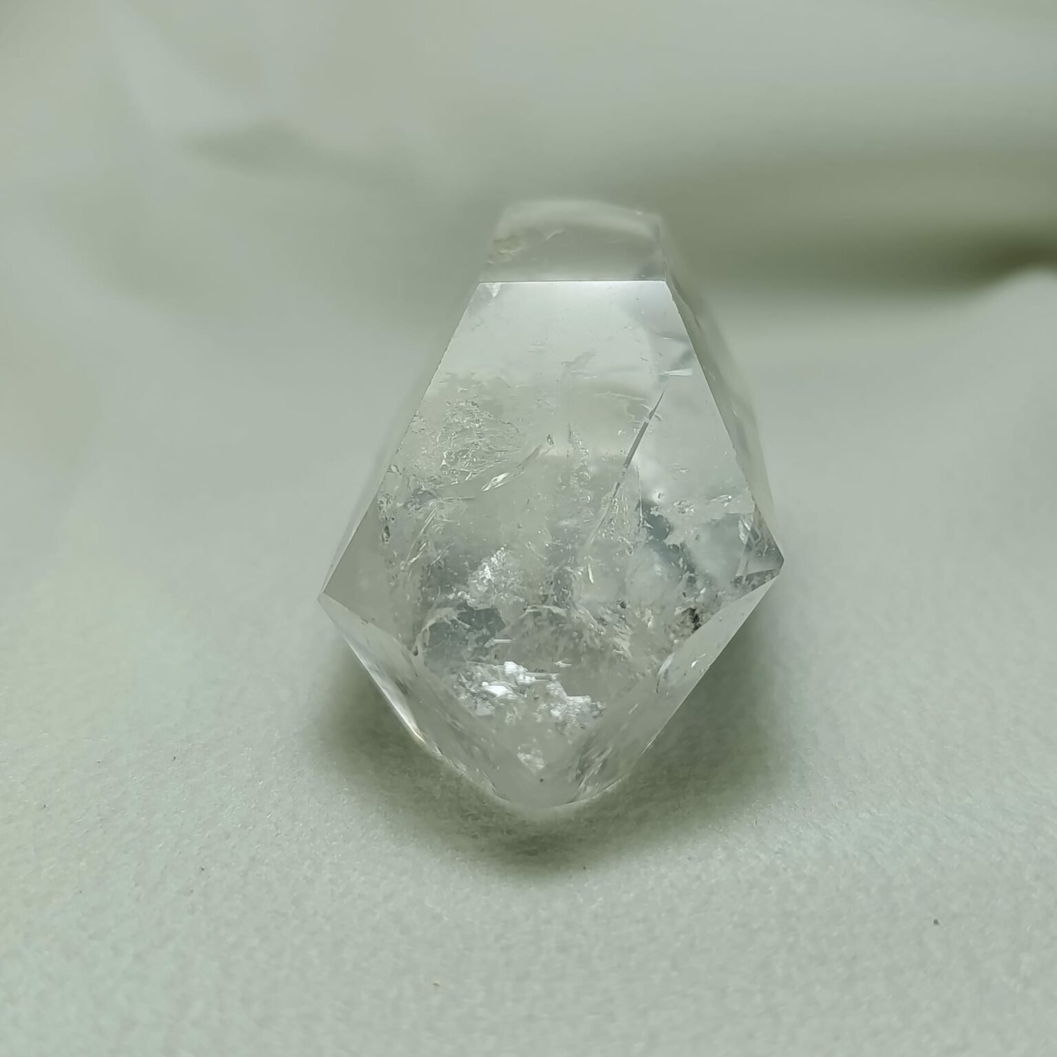 Cuarzo biterminado de cuarzo hialino (cuarzo cristal de roca). Biterminado natural. Transparencia media-alta, con zonas internas dispersas. Sistema trigonal. Dureza 7 (Mohs).