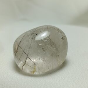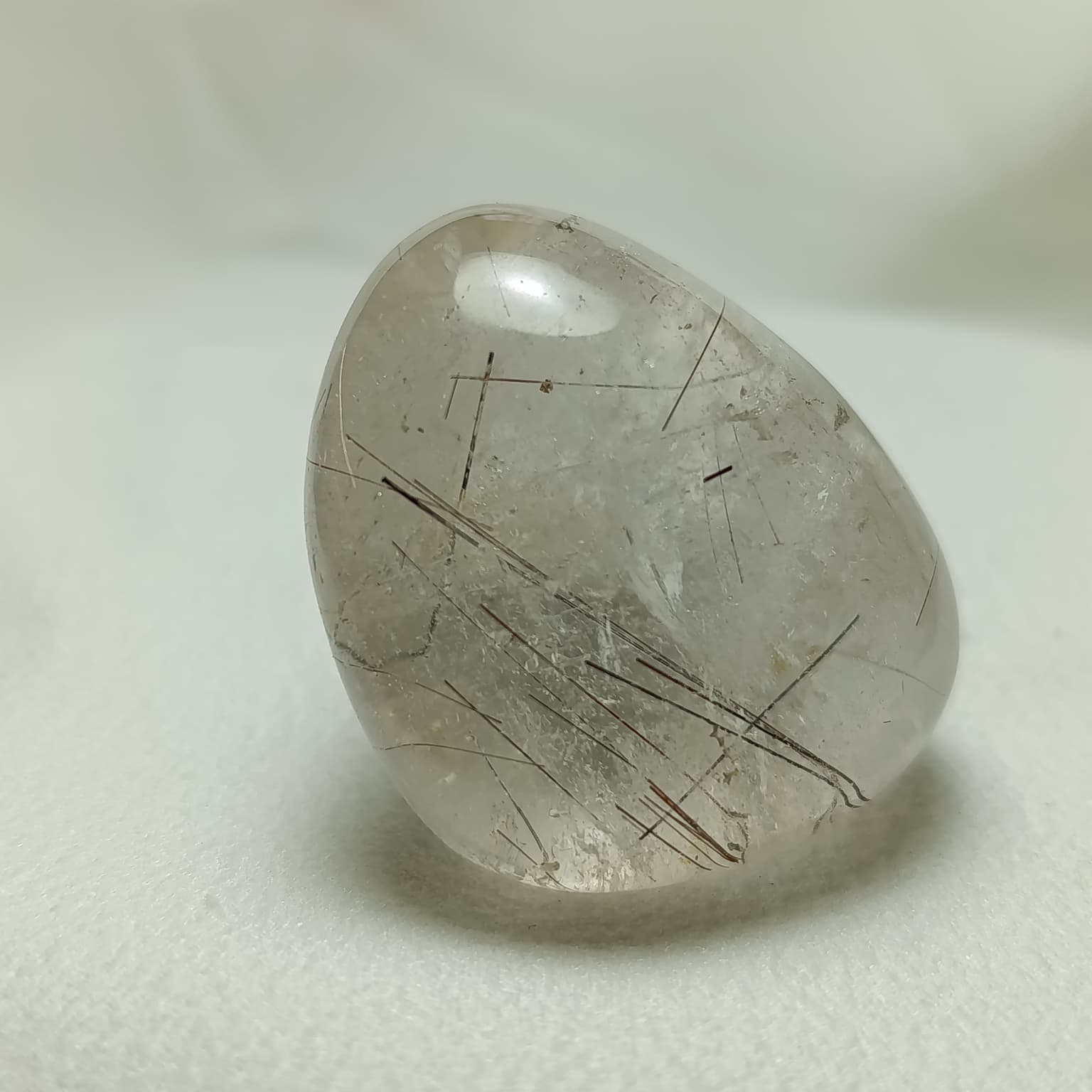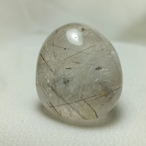 El cuarzo rutilado es generalmente un cuarzo cristal con unas formaciones internas de rútilo, unos hilos metálicos de dióxido de titanio. Esta pieza presenta rútilo color cobre oscuro y plata.