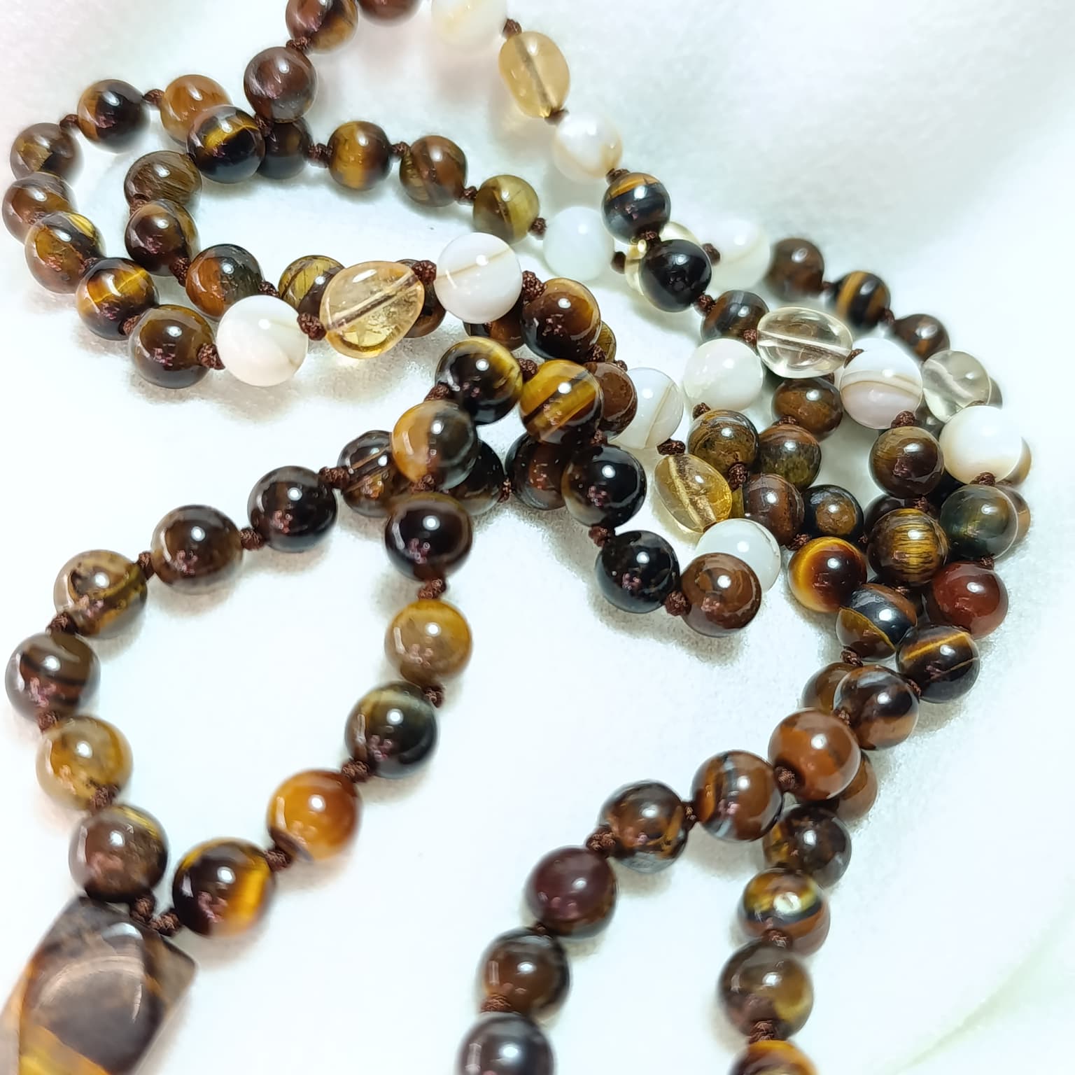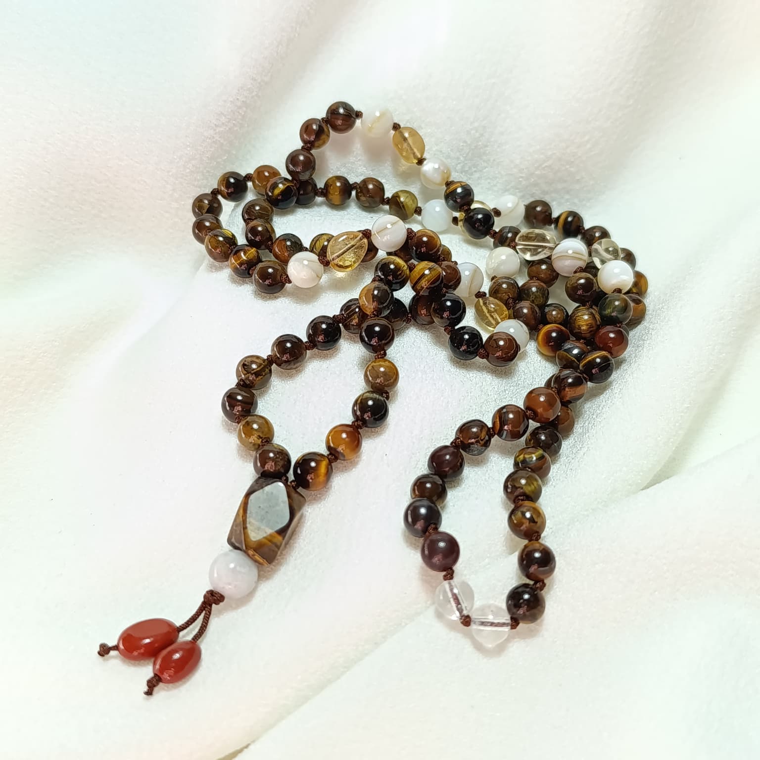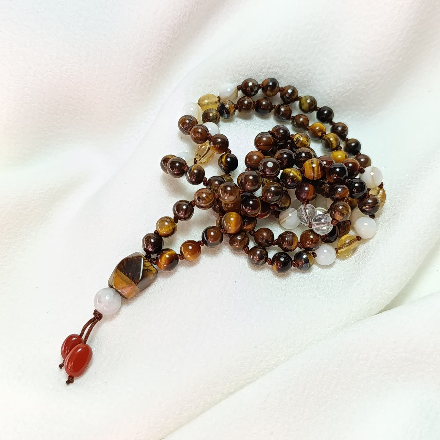 Japa mala de cristales naturales, anudado a mano. Resuena energéticamente con los tres primeros centros vitales. Elementos Tierra y Fuego. 108 cuentas.
